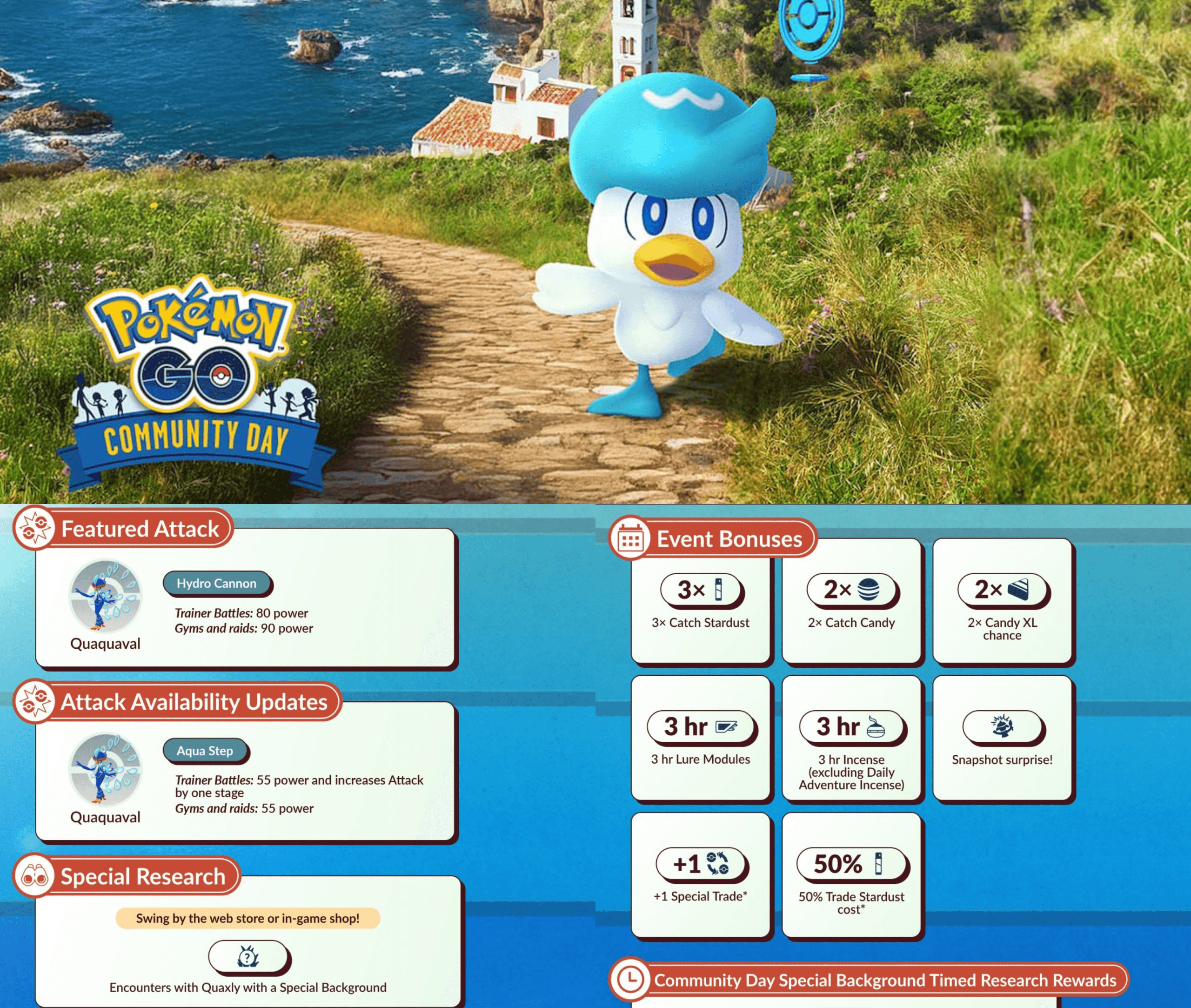 Ya se nos ha confirmado el nuevo Día de la Comunidad del mes de julio, se llevara acabo el 20 de julio y el Pokémon destacado será Quaxly, el cual podremos conseguir con mayor probabilidad shiny, al evolucionarlo durante el evento a Quaquaval podrá aprender su movimiento especial Aqua Step.